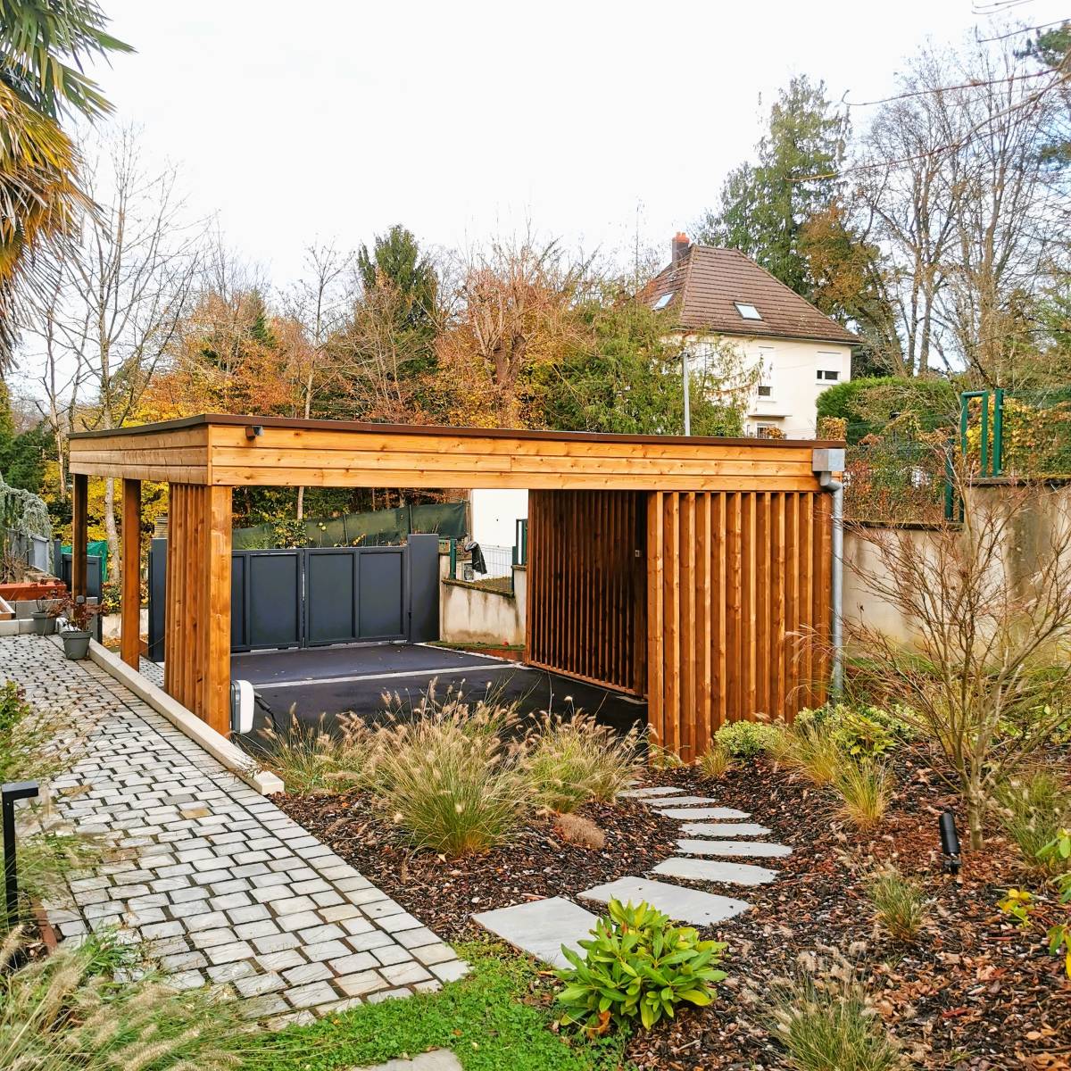 Pour cette réalisation, nous avons opté pour une finiton toit plat, conférant une esthétique épurée et contemporaine. Le bardage vertical ajouré apporte une touche d'élégance tout en laissant filtrer la lumière et l'air.